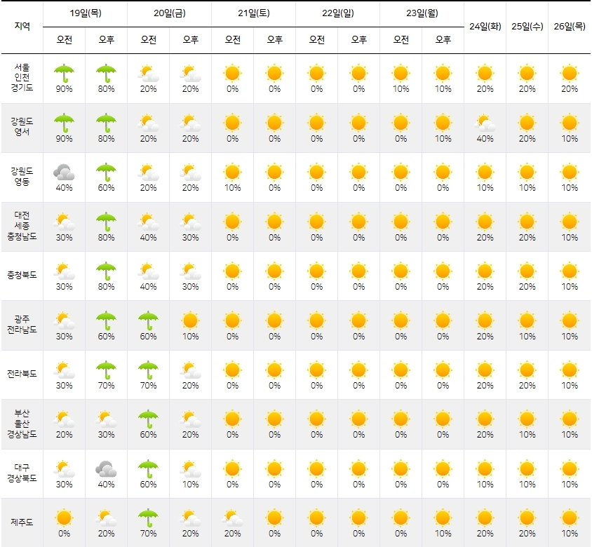 - 강수 : 19일(목) 중부지방과 전라권에, 20일(금) 남부지방과 제주도에 비가 오겠습니다.