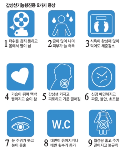 많은 사람들은 소화 불량과 음식 섭취에 변화가 없음에도 불구하고 체중 감소의 증상은 위와 대장에 문제가 있어요. 그러나 갑상선 기능 항진증 증상 중 식욕 감퇴와 체중 감소도 특징이지요. 여성의 경우 월경 주기가 불규칙해 지고 월경량이 떨어지며 주기가 불규칙해 질 수 있어요.