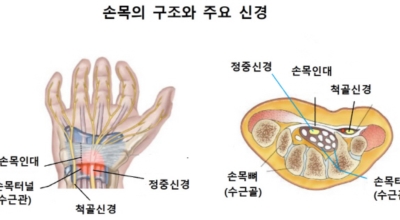 흔하게 손이 저리면 혈액순환장애를 먼저 떠높여주고 혈액순환 개선제를 복용하던가 온찜질 등으로 증상을 완화시키려고 시도합니다. 하지만 대부분의 손 저림증은 ‘손목 터널 증후군’이라 하는 병에 의하여 발생한다는점 아시나요? 손목에서 손으로 이어지는 부위에는 뼈와 인대로 둘러싸여있는 ‘손목터널 혹은 수근관이 존재하는데 이 터널을 통해 손가락을 구부리는 9개의 힘줄과 손의 바닥 쪽 감각 또는 엄지손가락의 일부 운동기능을 담당하는 정중신경이 지나가서 손이 제 역할을 할 수 있게 합니다.