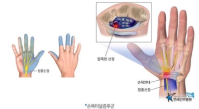 옆 손목 인대가 두꺼워지거나 근육근이 과도하게 이용돼 자극을 받고 염증이 있다면 힘줄을 둘러싼 막이 두꺼워져 붓습니다. 이때 손근 굴(손근 관) 내 구조물의 부피가 증가하면서 상대적으로 공간이 좁아지고 정중신경이 눌리게 돼요. 그리고 감염이나 손목 골절로 인한 변형, 관절 탈구, 종양 등에 의해 나타날 수도 있어요.