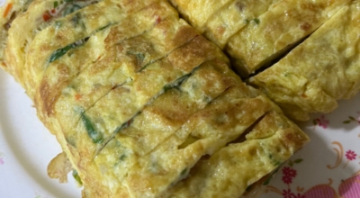 팬에 기름을 발라준 다음 계란물 만든 것으로 모두 부어주어요. 뚜껑을 닫고 5~6분 정도 익혀줍니다. 그런 다음 접시를 받쳐서 계란을 뒤집어 담습니다. 그러면 완전히 익지 않은 계란물이 흘러나올텐데요, 괜찮습니다. 다시 넣어서 찔거라서 그대로 계란물이 흘러나와도 무방합니다. 팬에 기름칠을 한번 더 해 주고, 계란 한 개를 풀었던 것에 소금조금 넣은 다음 반만 부어줍니다.