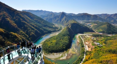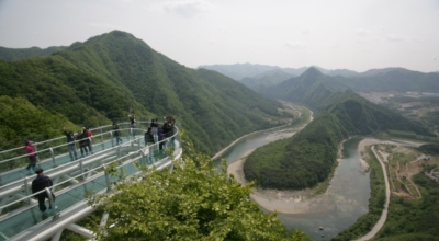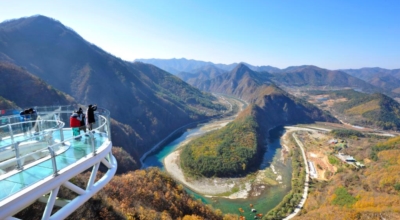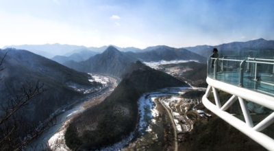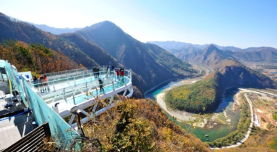 페러글라이딩을 타지 않고도 페러글라이딩을 타는 느낌이 나며 한반도 남쪽인 밤섬쪽을 향해 내려가고, 주변의 아름다운 경관과 아찔함을 느껴보시는것도 큰 재미중 하나라고 합니다. 스카이워크는 강변 583m의 절벽 끝에 길이 11m의 U자형 구조물로 마치 구름위로 걷는 경험을 선사해 줄 수 있어요.